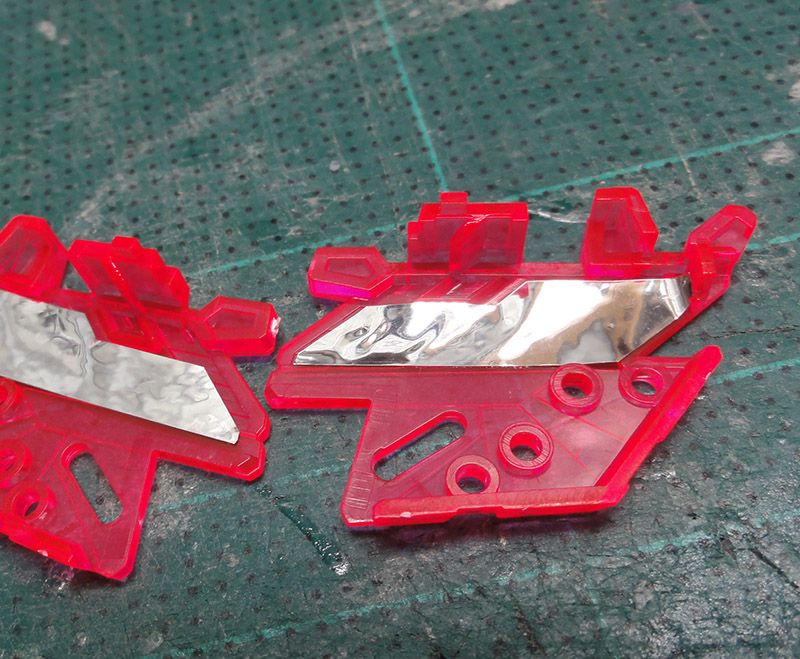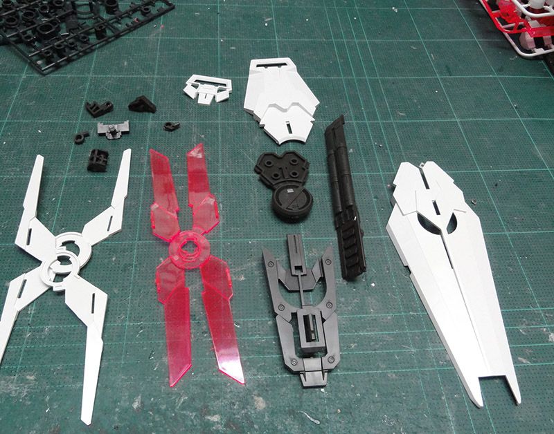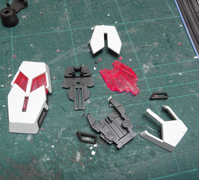 ส่วนเรื่องเข่า.....  เอาง่ายๆเวลาขยับเข่า เข่ามันจะไปชนครีบที่หลังขา.....  เราก็ลดขนาดครีบลงเหมือนกล่อง OVA แล้วก็ยืดข้อพับเข่าให้สูงขึ้นจนเวลาขยับแล้วมันไม่ไปชนครีบพอดีเป็ะ แค่นั้น